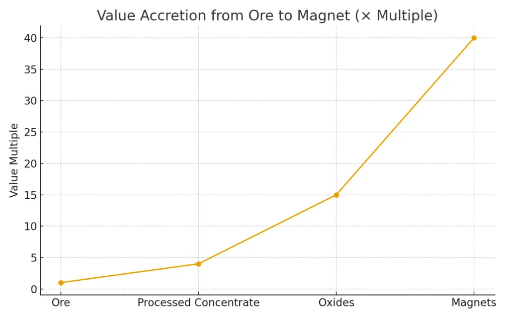 Nations without processing capability remain trapped at the lowest end of the value chain — exporting raw minerals and importing high-value oxides, metals, and magnets at a premium.